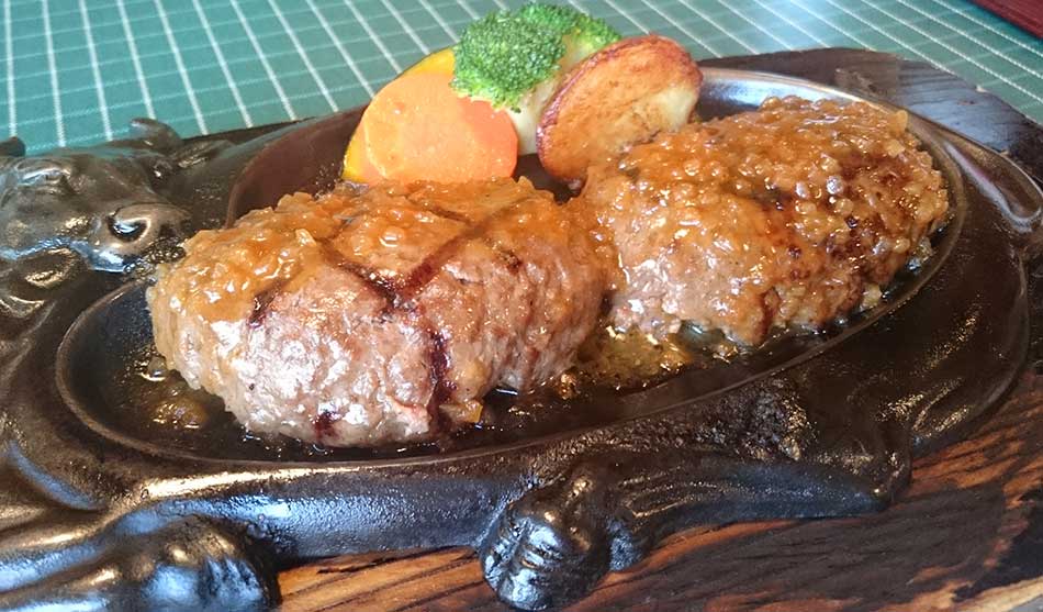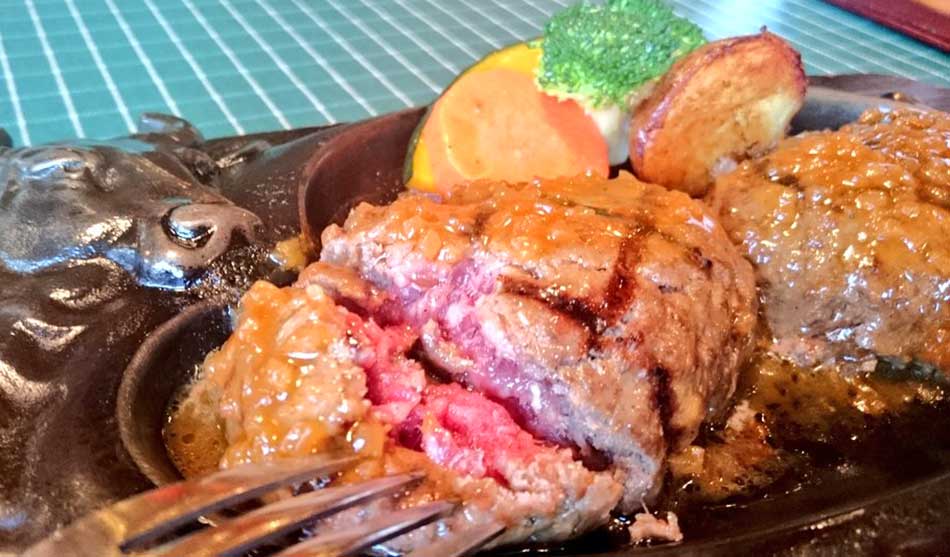 お店の方のオススメ、中が少し赤いくらいのミディアム・レア(というけど結構赤かった)でオーダーして、まるっとした状態のハンバーグを店員さんが2つに切って、熱々の鉄板でさらにジュージューと追い焼きしてくれます。