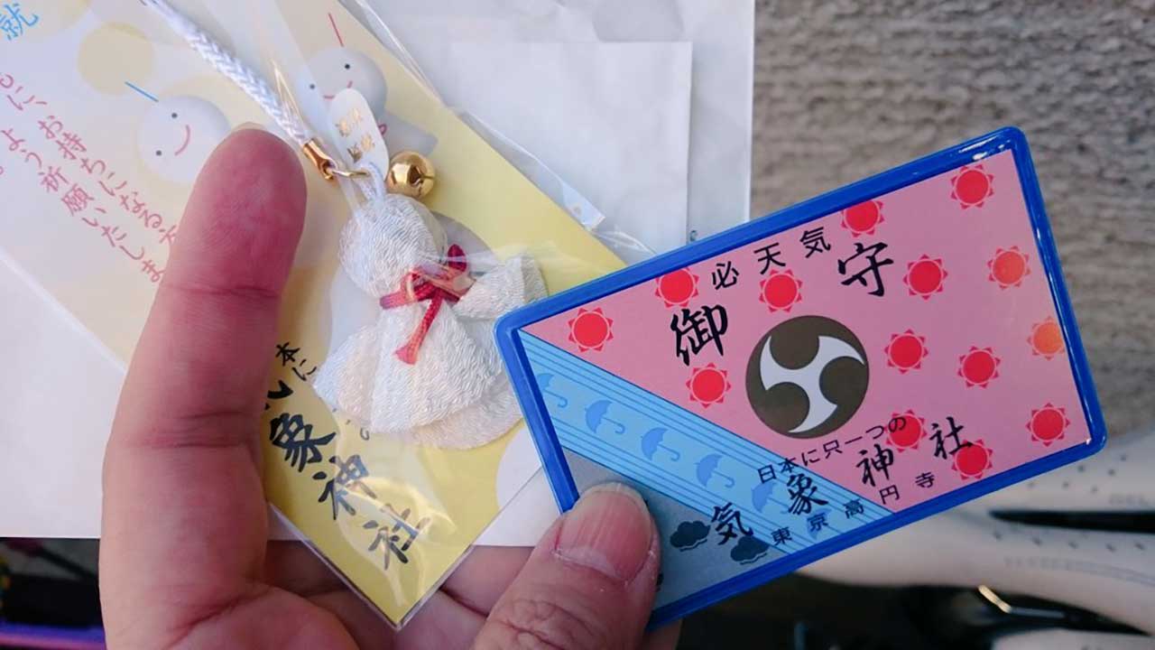 てるてる坊主型のが可愛いけど、神社の方曰く、パウチのカード型のが「気象神社のお守り」なんだそうです。