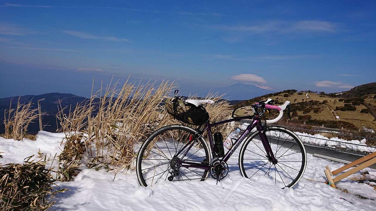 戸田峠から達磨山までの間、日陰の部分でちょいちょいこんな凍結(残雪が固まったもの)があり、登るのには問題ないけど、調子良くダウンヒルしてると危ないと思う。土肥や天城側からライドする人は気をつけて!