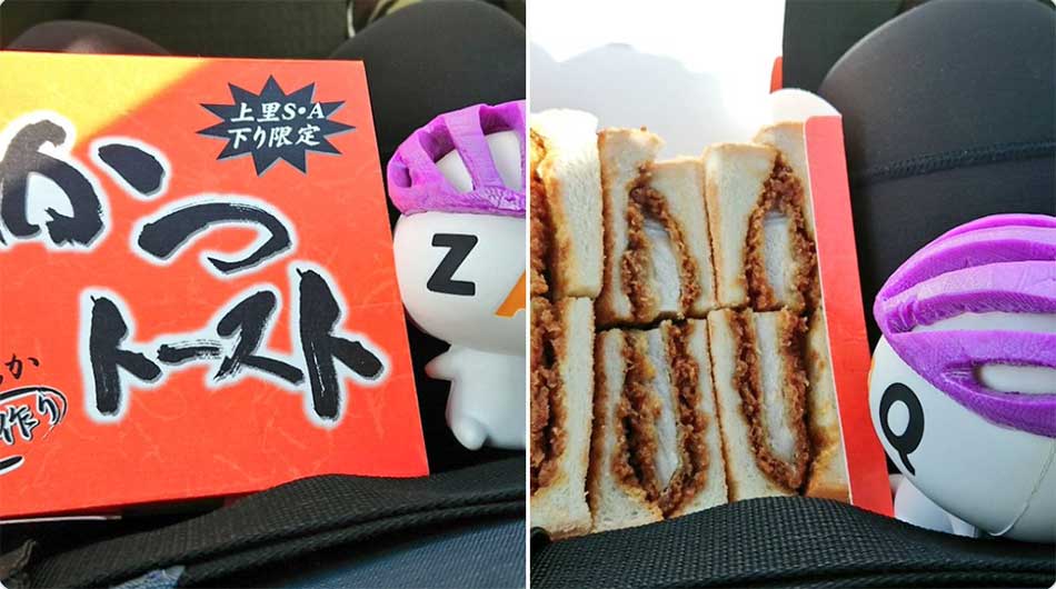 関越自動車道・上里SAで名物のカツサンドを買って朝ご飯にします。