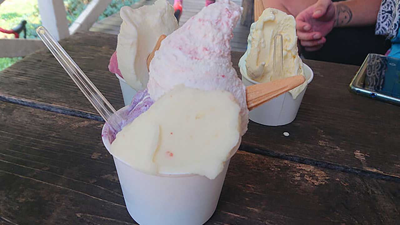 私はトリプル。白雪姫(イチゴの果実入り)、ブルーベリー、リンゴの3味。