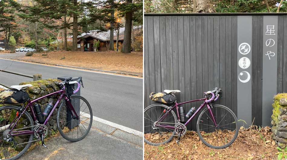 星野やに泊まってる風な写真を撮ってみたかったけど、ただの記念写真になった…。