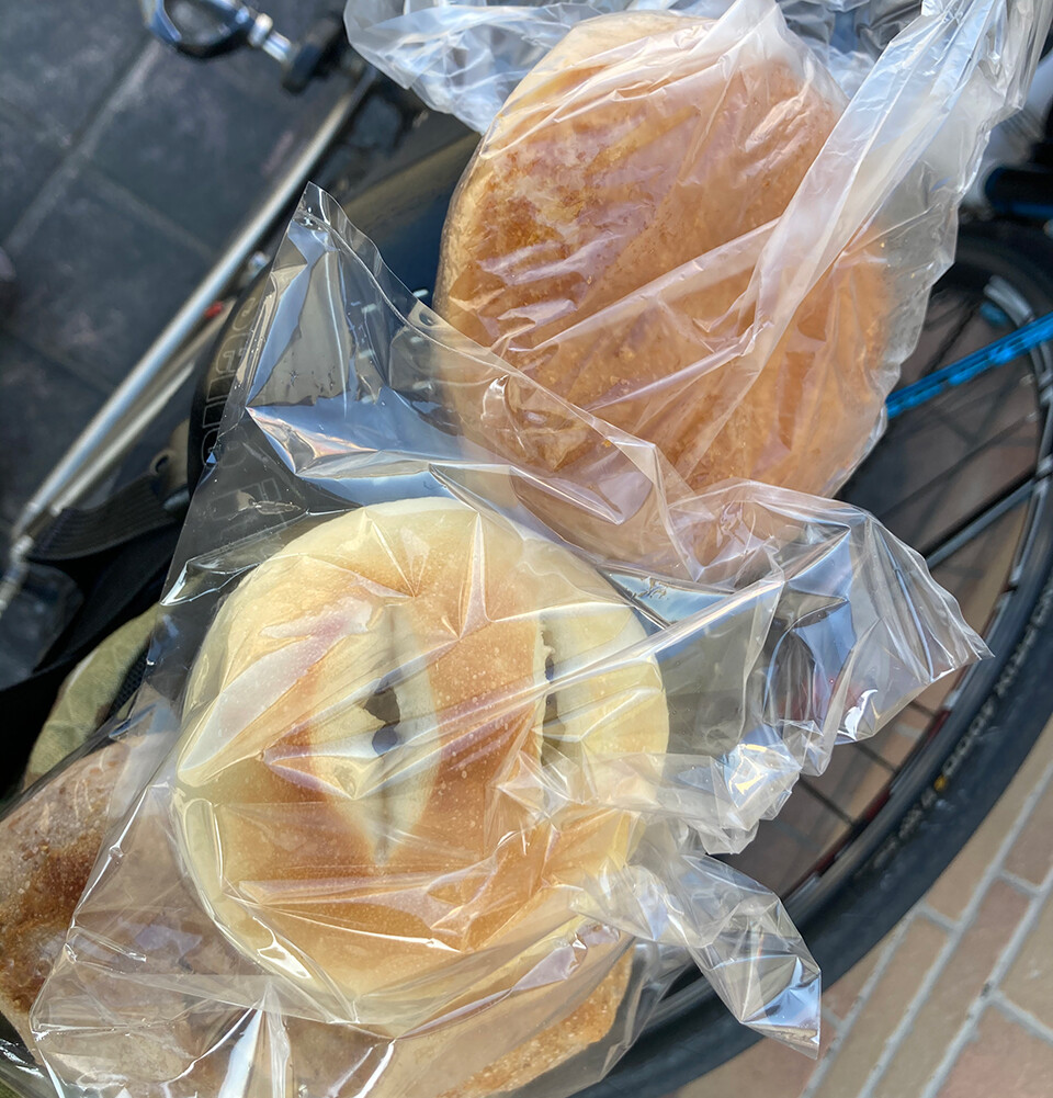 3つ買って、1つ食べて残りはサドルバッグに詰めてお持ち帰り。