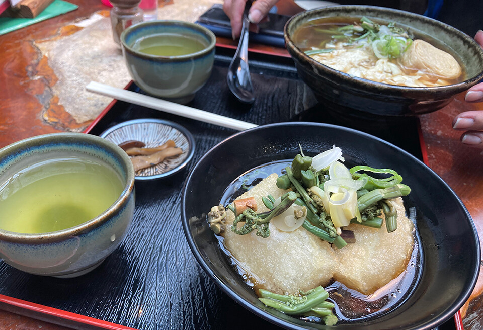 お腹あんまりすいてないけど、ここでランチ食べないと、この先お店が閉まってたりしたら困るから…ということで、竜頭の滝の茶屋で軽食を( ‘༥’ )ŧ‹”ŧ‹” 私はお雑煮。揚げたお餅が3つも入ってた! あきあきしゃんは湯葉蕎麦。