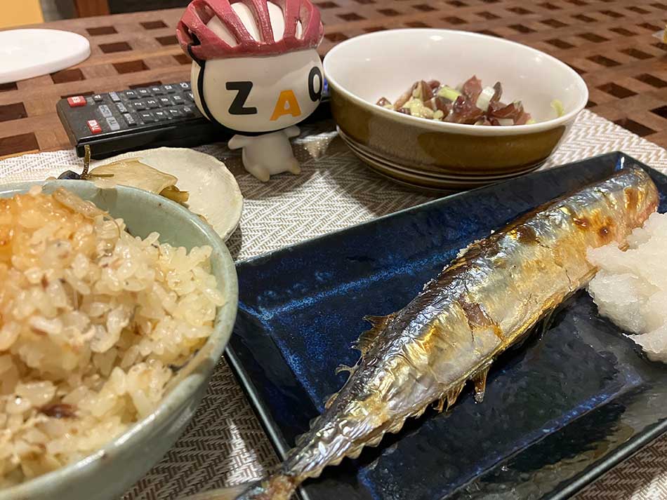 帰宅して食べた秋の味覚。さんまご飯とさんまの塩焼き、キクラゲのごま油和えと浅漬け。